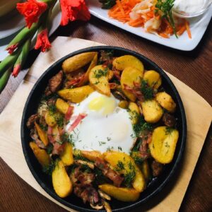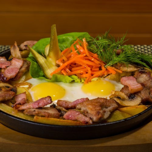 Угощение на сковороде с яйцом, свининой, картофелем деревенским и грудинкой